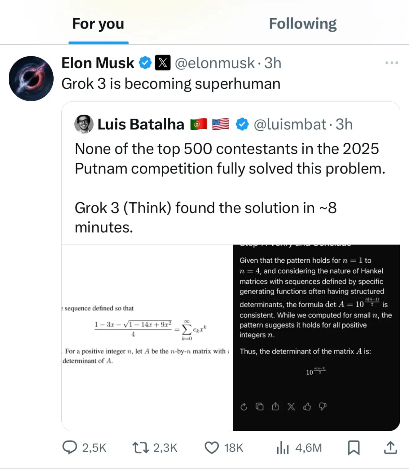 Most recently, Musk shared a tweet from user Luis Batalha, praising Grok-3’s “extraordinary” progress. The tweet claimed that Grok-3 had solved the hardest problem in the 2025 Putnam Mathematics Competition.